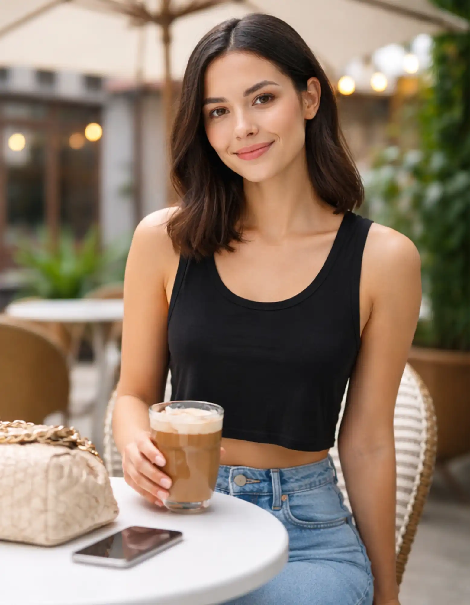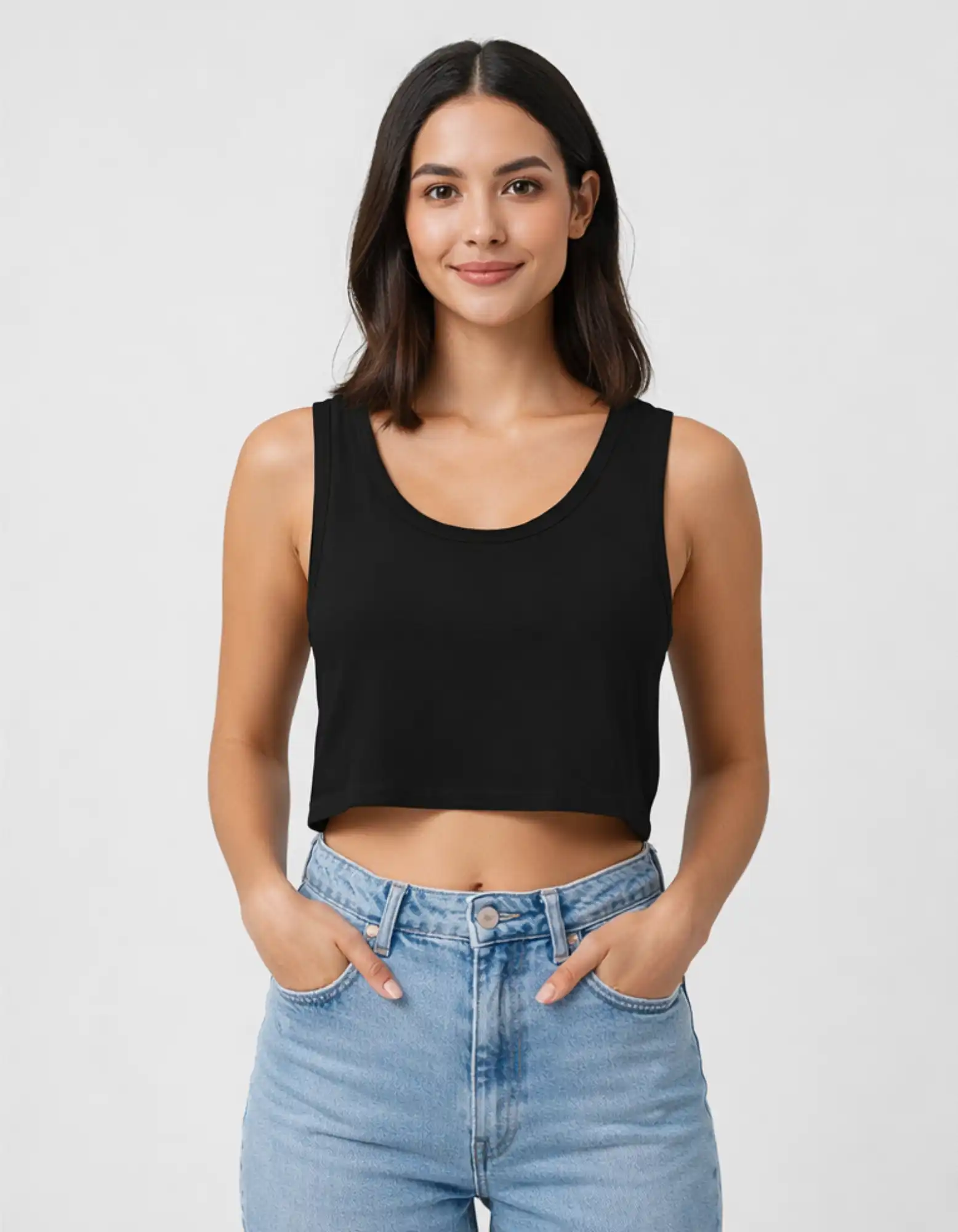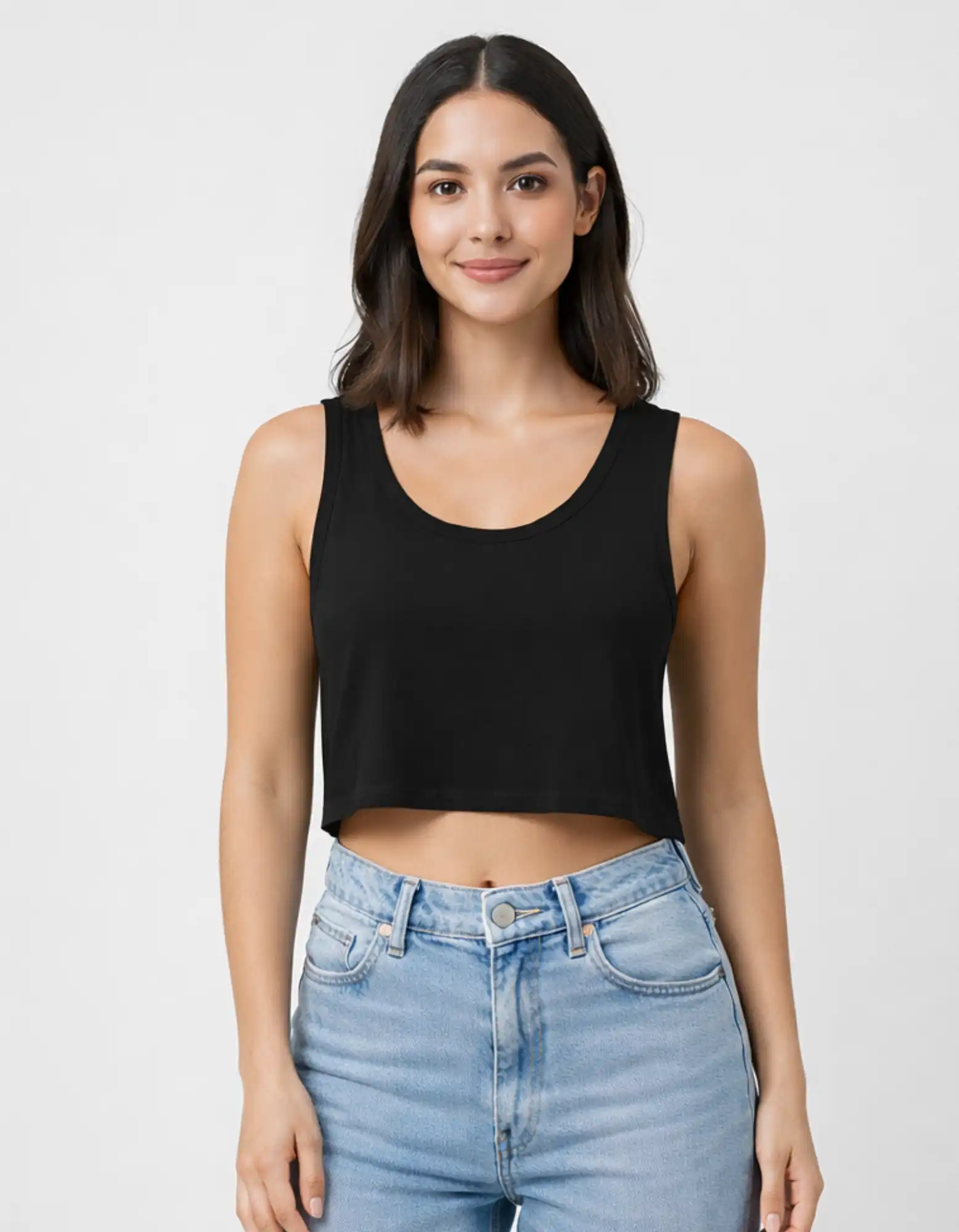 A clean black crop tank made from 180 GSM cotton — breathable, soft, and perfect for everyday styling.