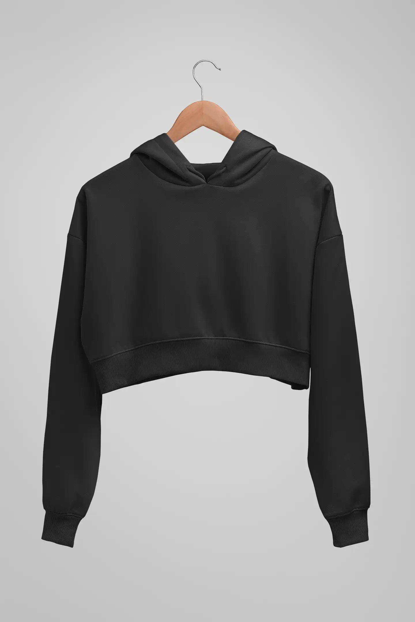 A classic black cropped hoodie made from 300 GSM cotton blend fabric for everyday comfort and versatile styling.