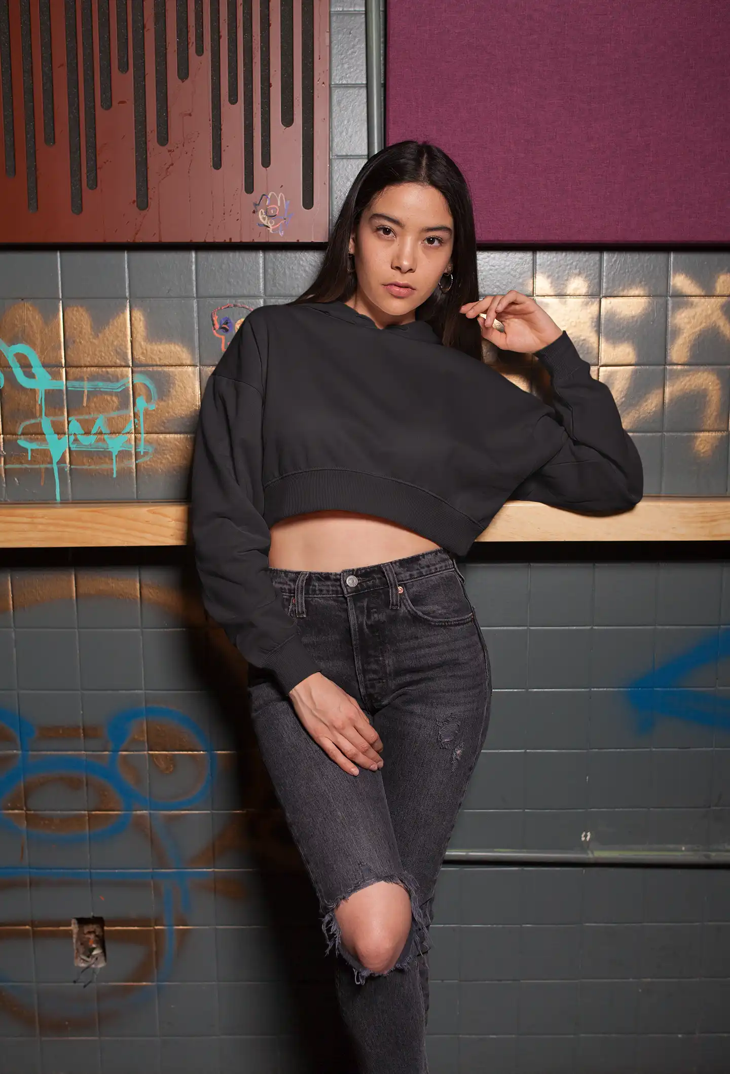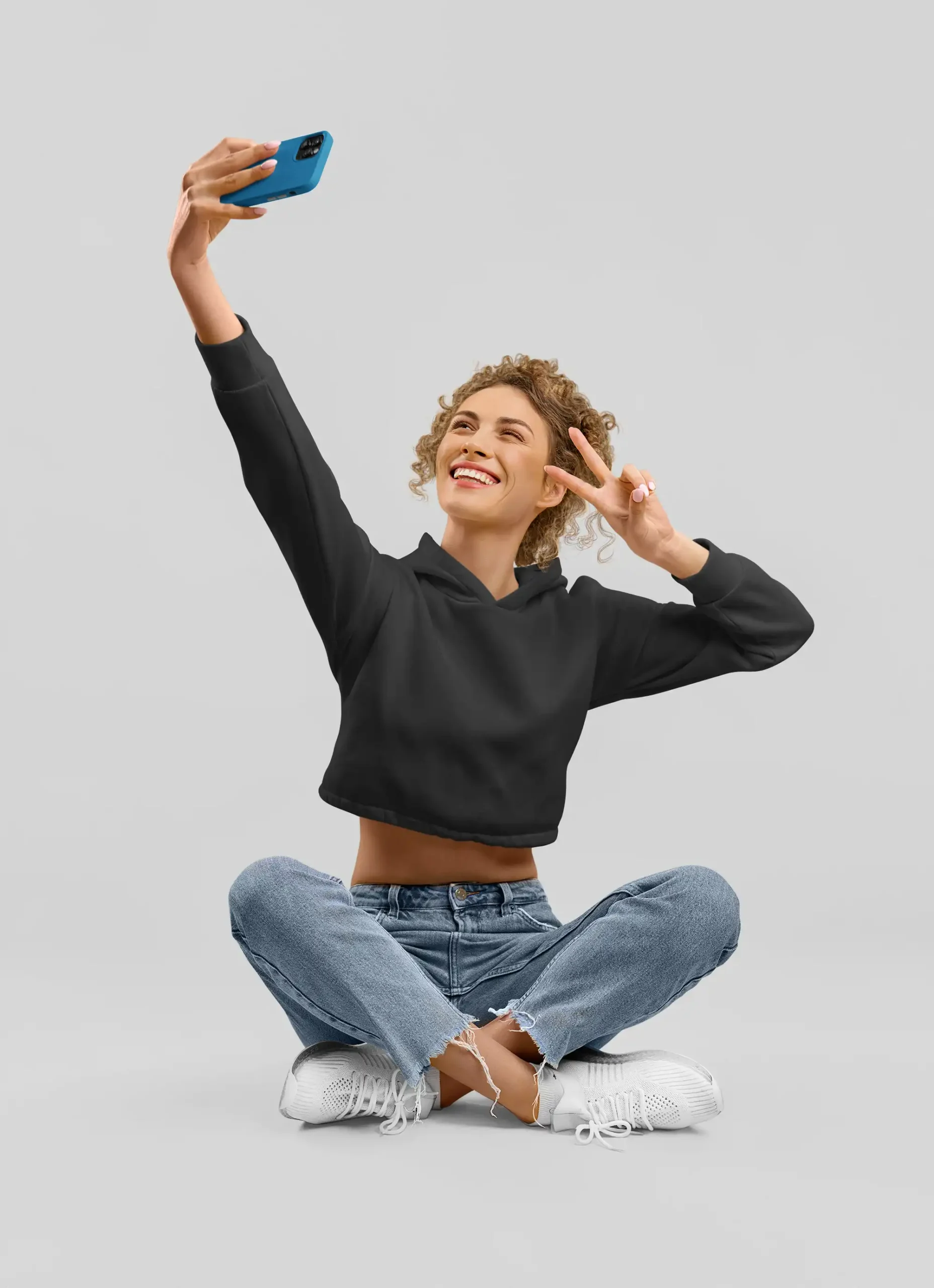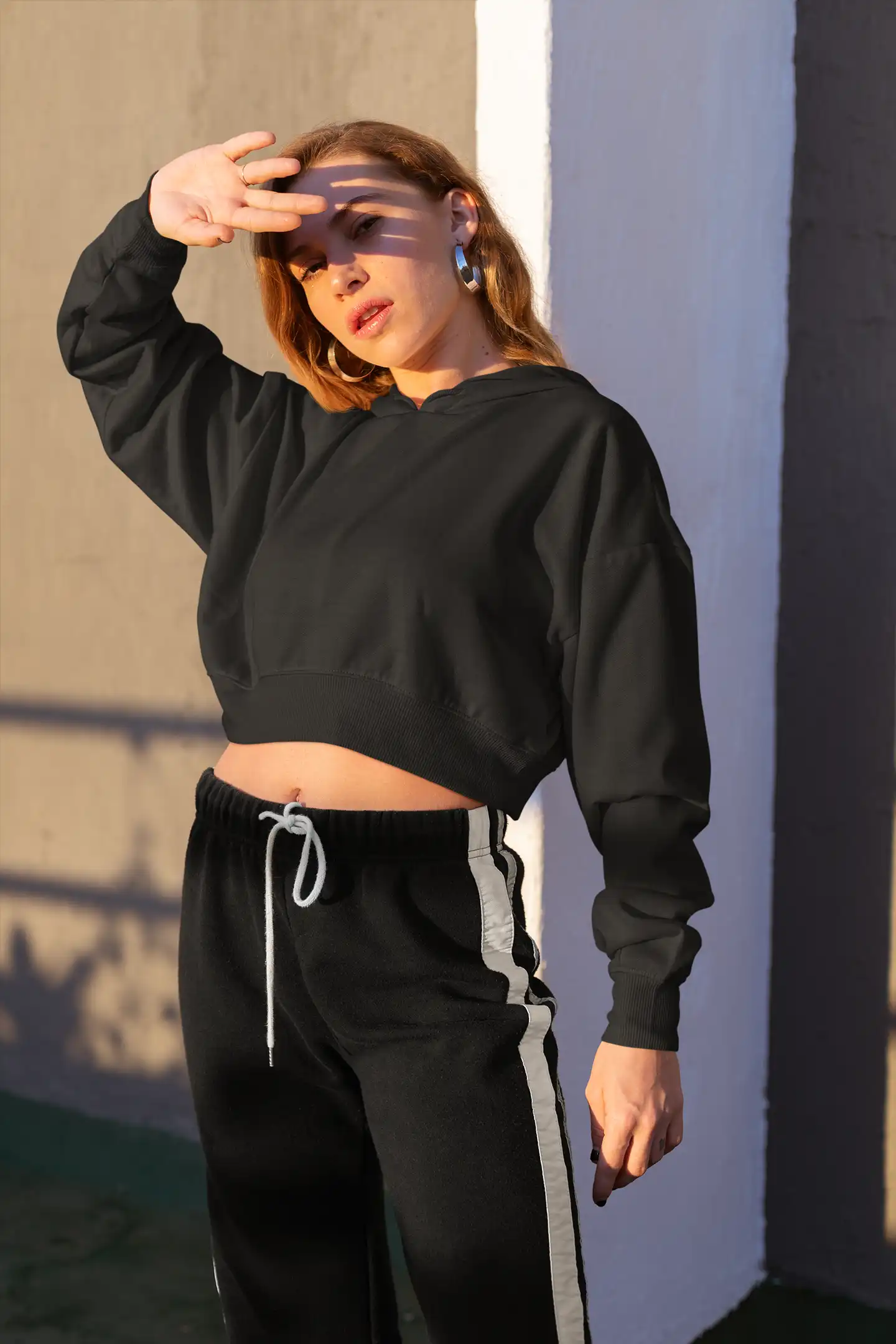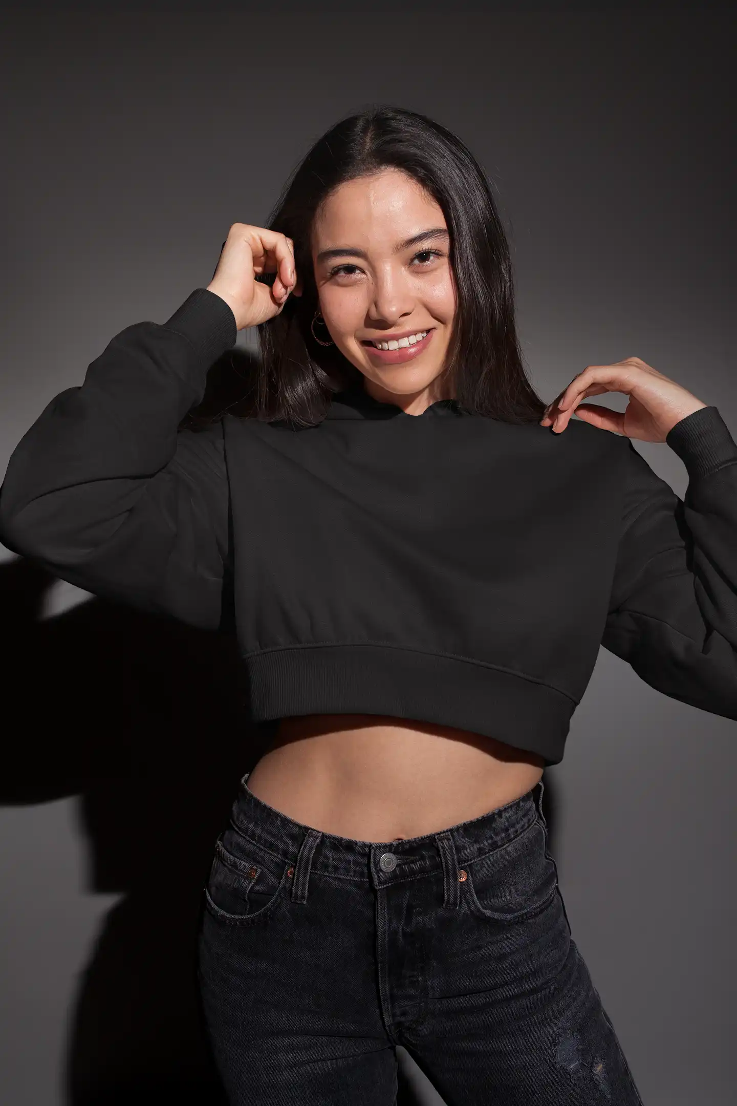 Woman wearing M4S Solids Black Cropped Hoodie in a studio 1Woman wearing M4S Solids Black Cropped Hoodie 2