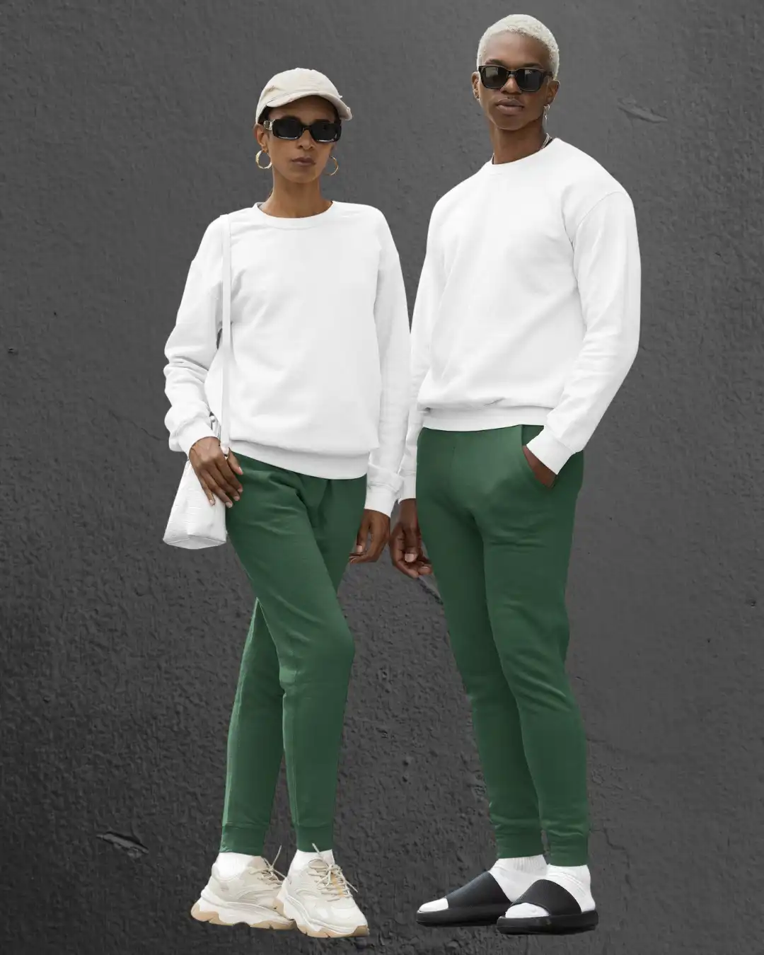 Flat Lay of M4S Solids Bottle Green Unisex JoggersCouple Wearing M4S Solids Bottle Green Unisex Joggers