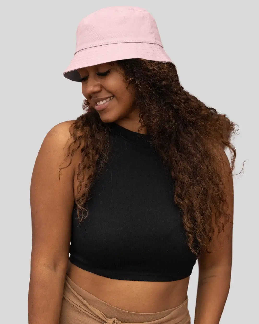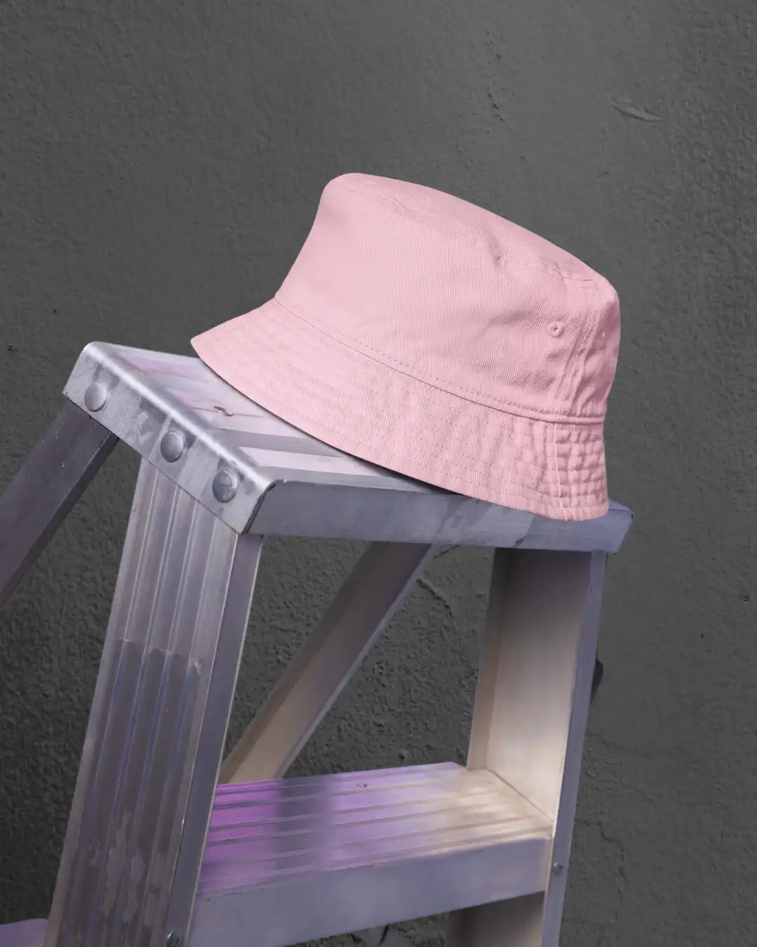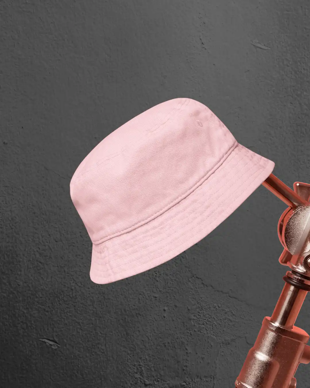 A light pink bucket hat crafted from 100% cotton with a soft brim — breathable, foldable, and perfect for everyday wear with a subtle pop.