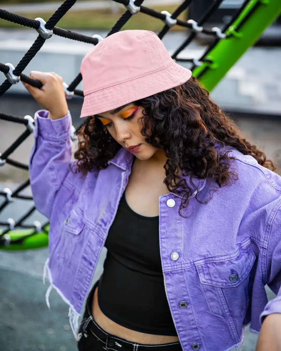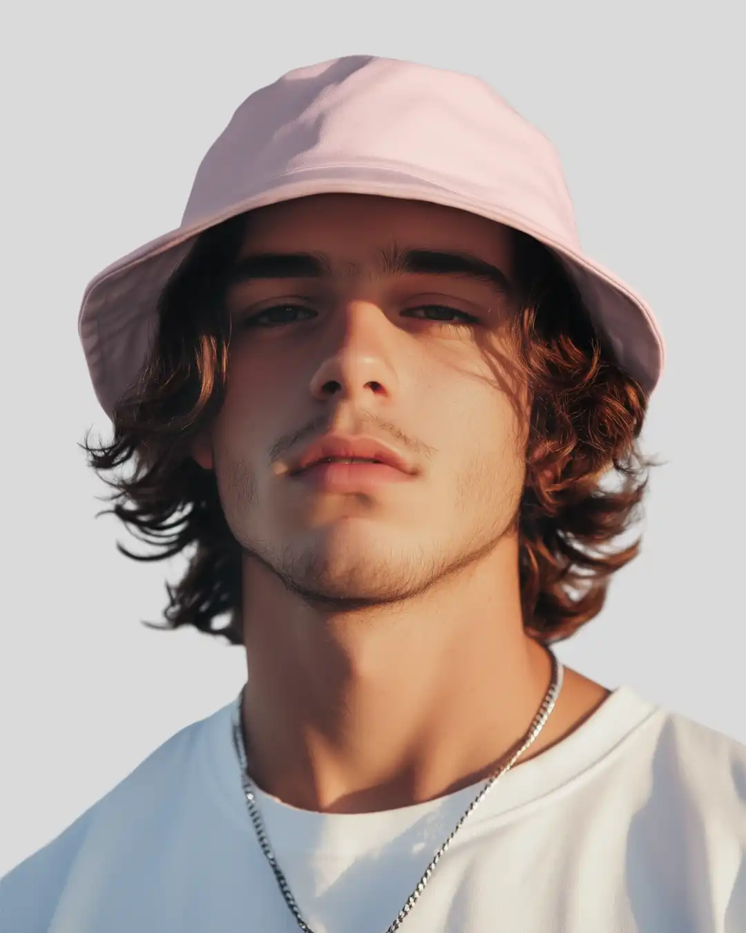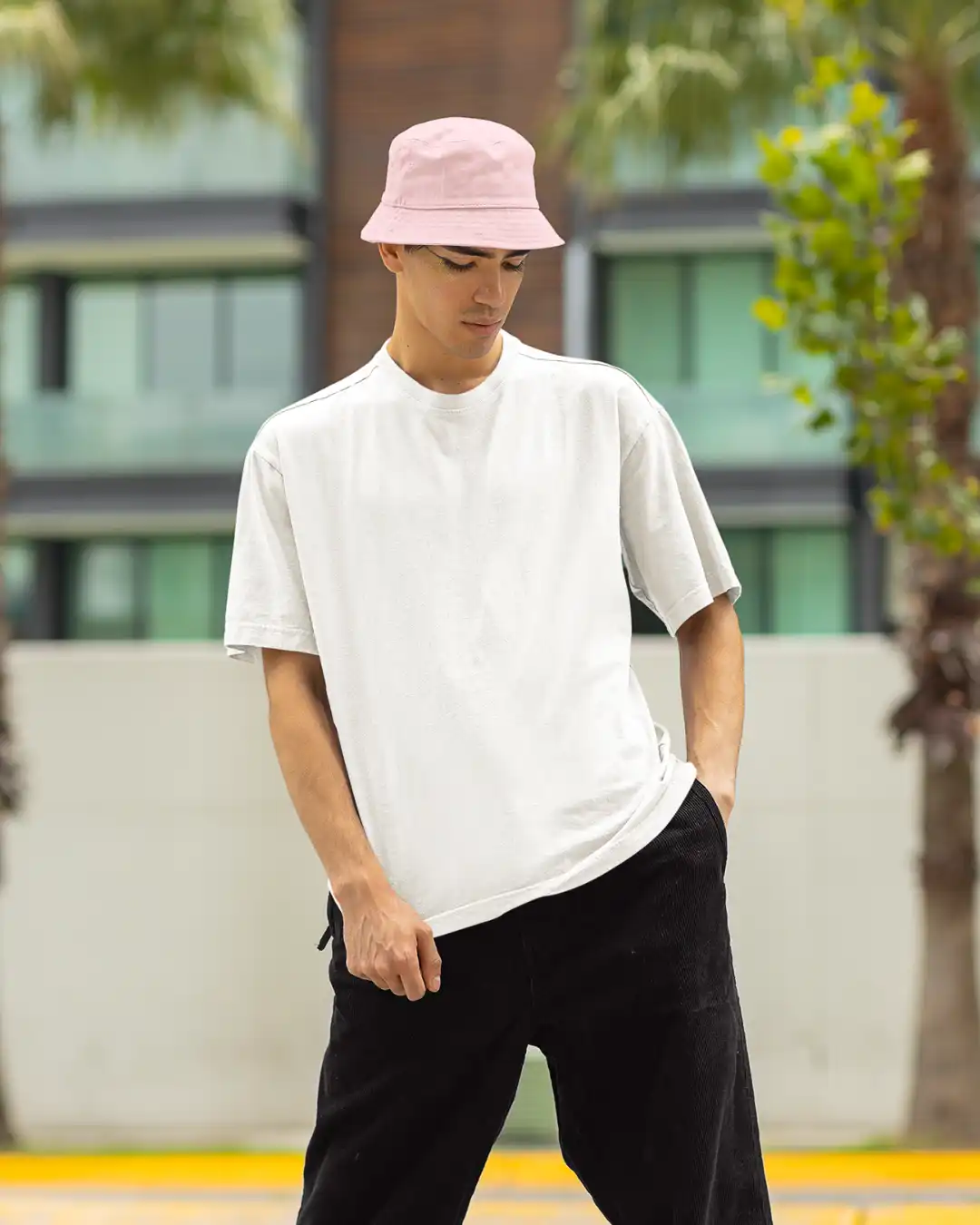 A light pink bucket hat crafted from 100% cotton with a soft brim — breathable, foldable, and perfect for everyday wear with a subtle pop.