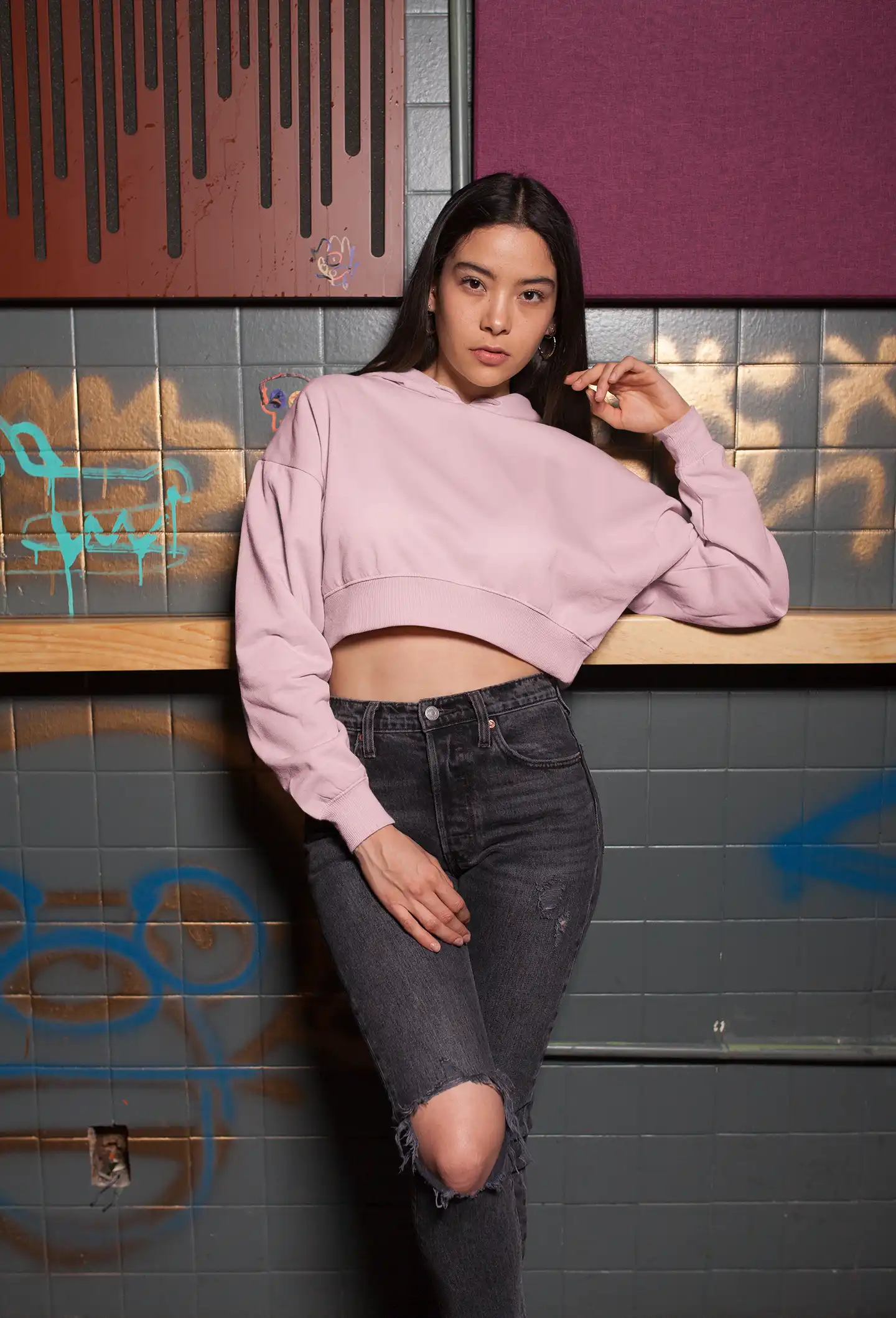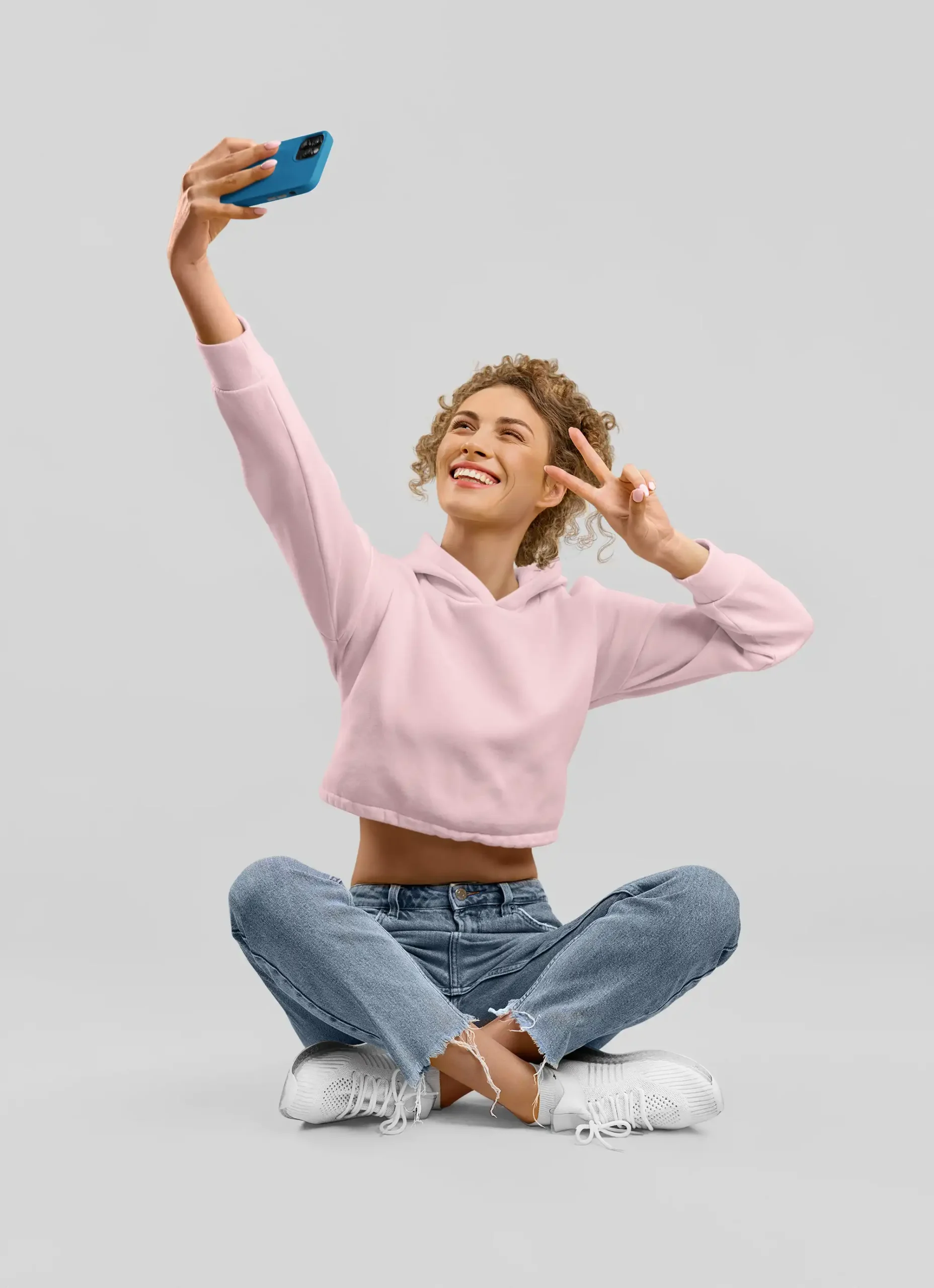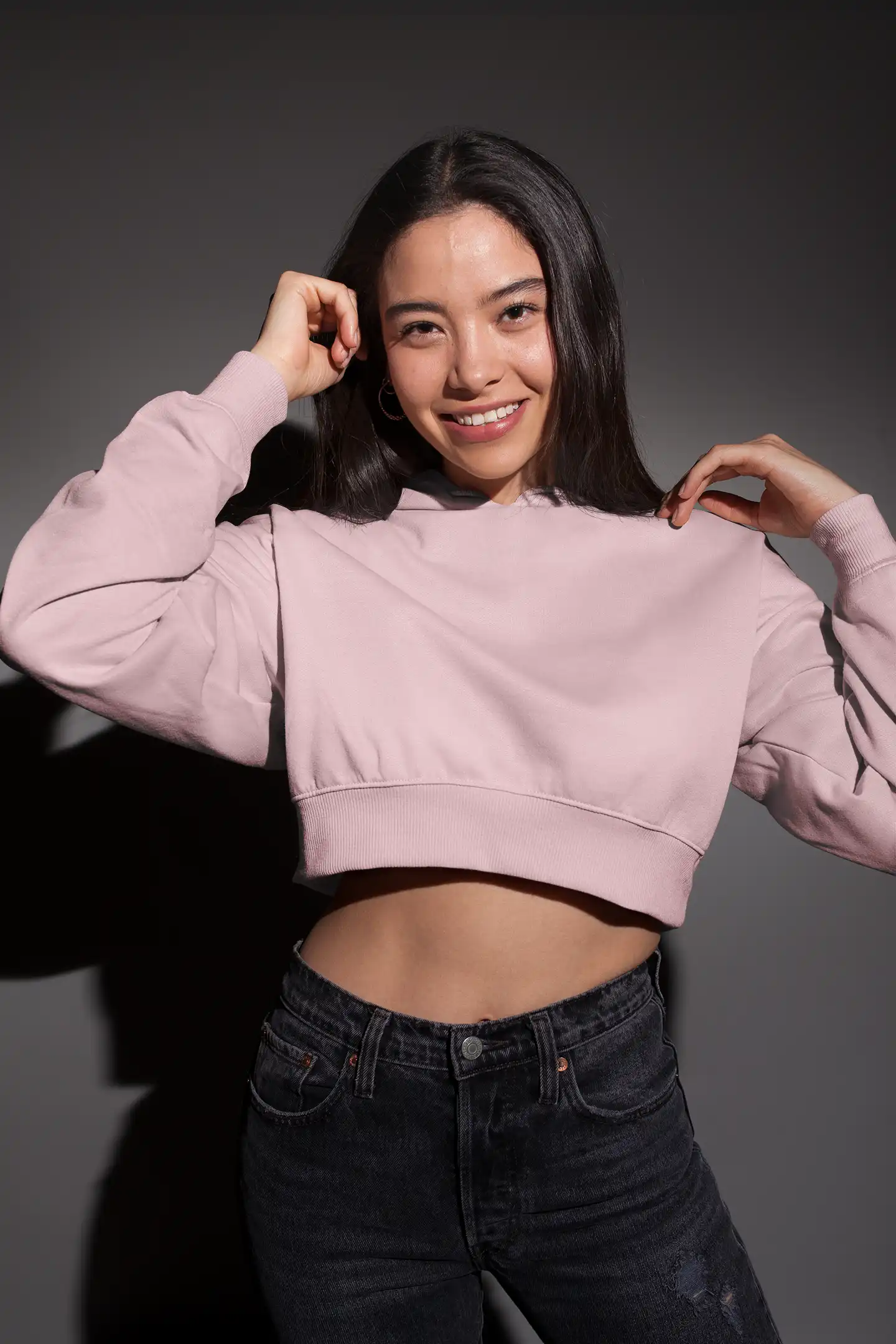 A soft light pink cropped hoodie made from 300 GSM cotton blend fabric for comfort, warmth, and a modern cropped fit.