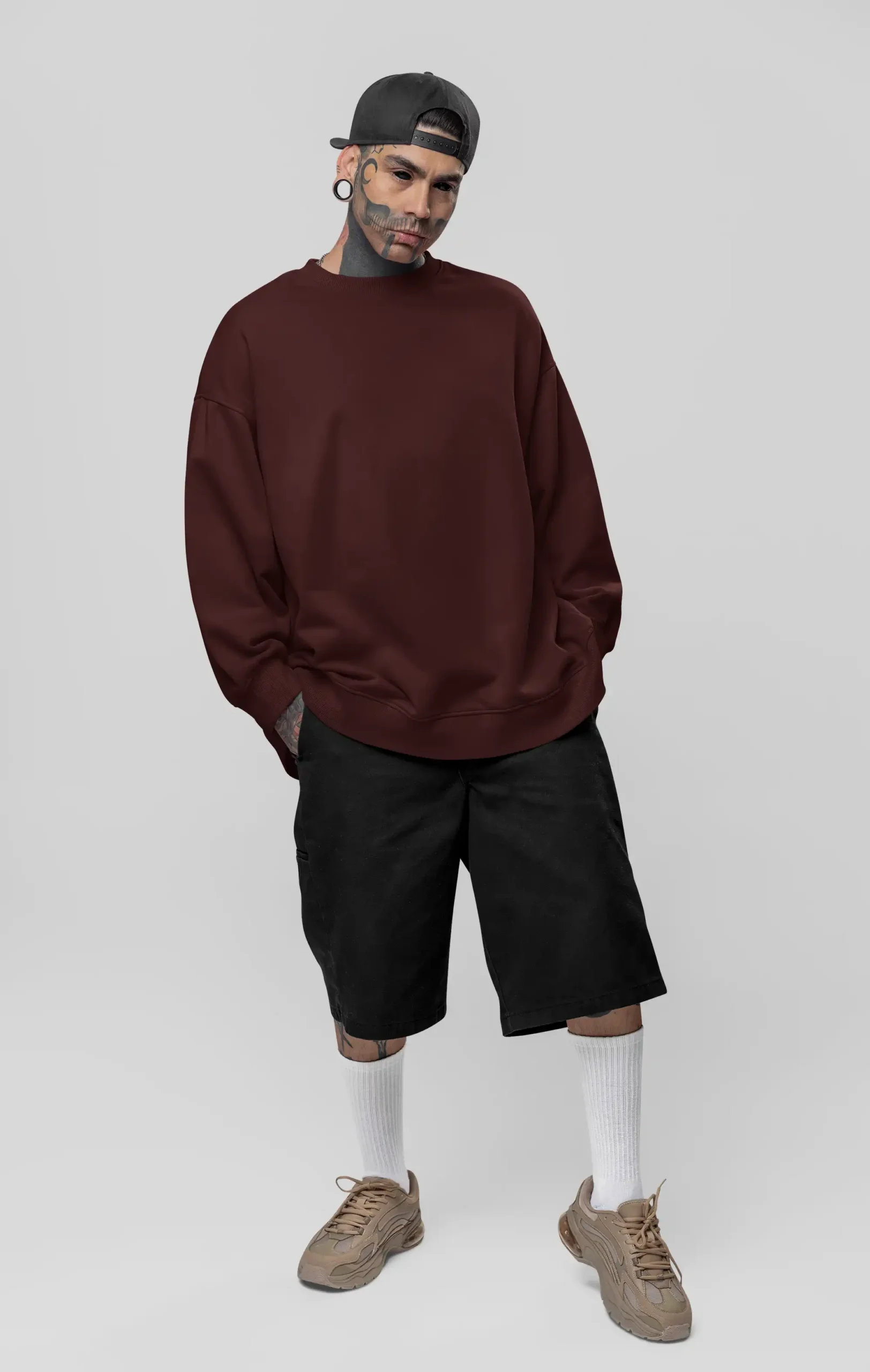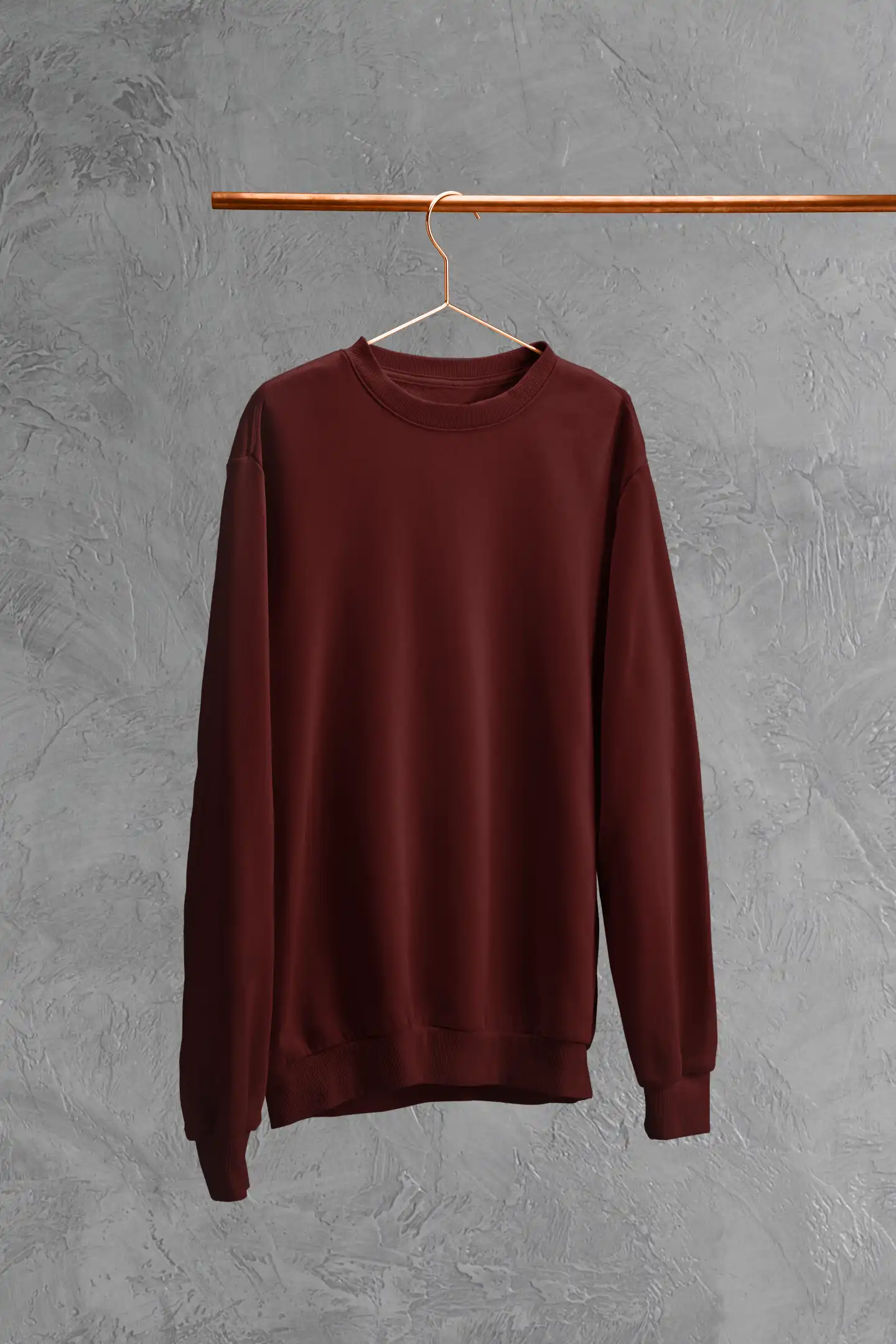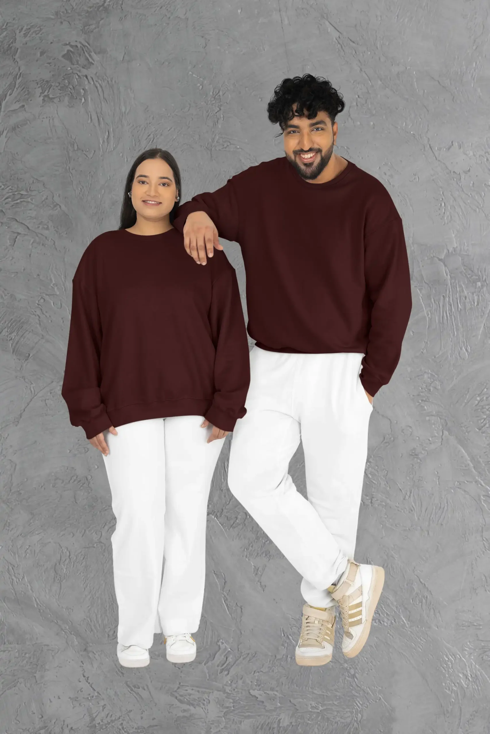 A rich maroon oversized sweatshirt made from 400 GSM cotton blend fabric for warmth and modern streetwear style.