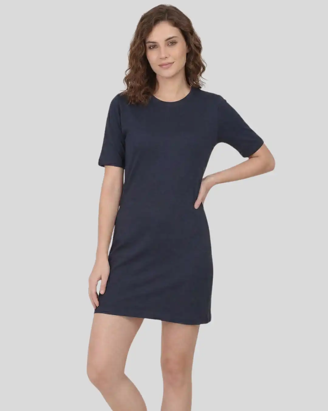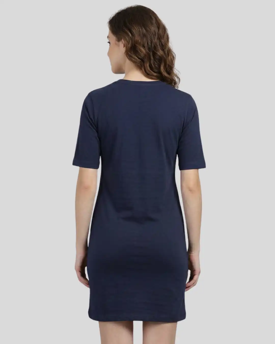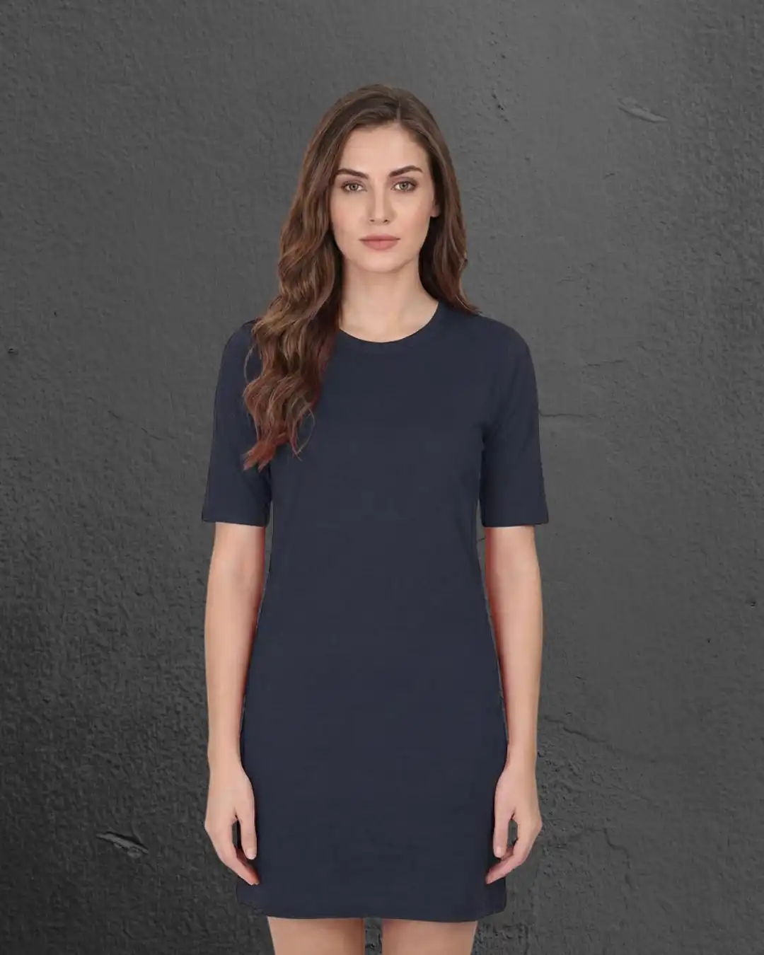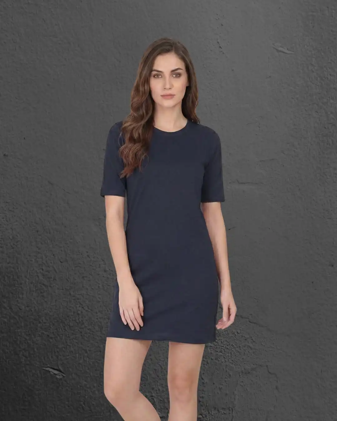 A classic navy blue t-shirt dress crafted from 180 GSM cotton for breathable comfort and everyday style.