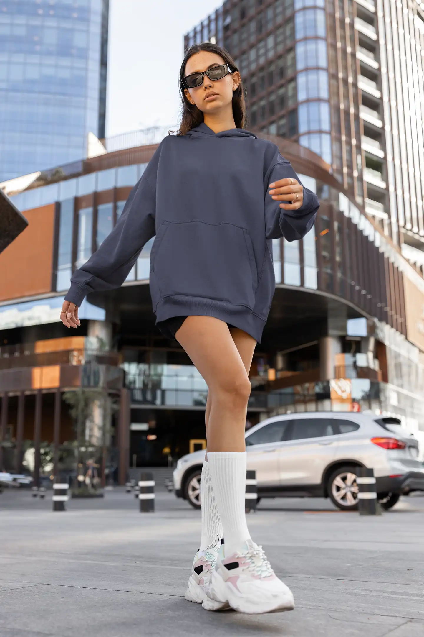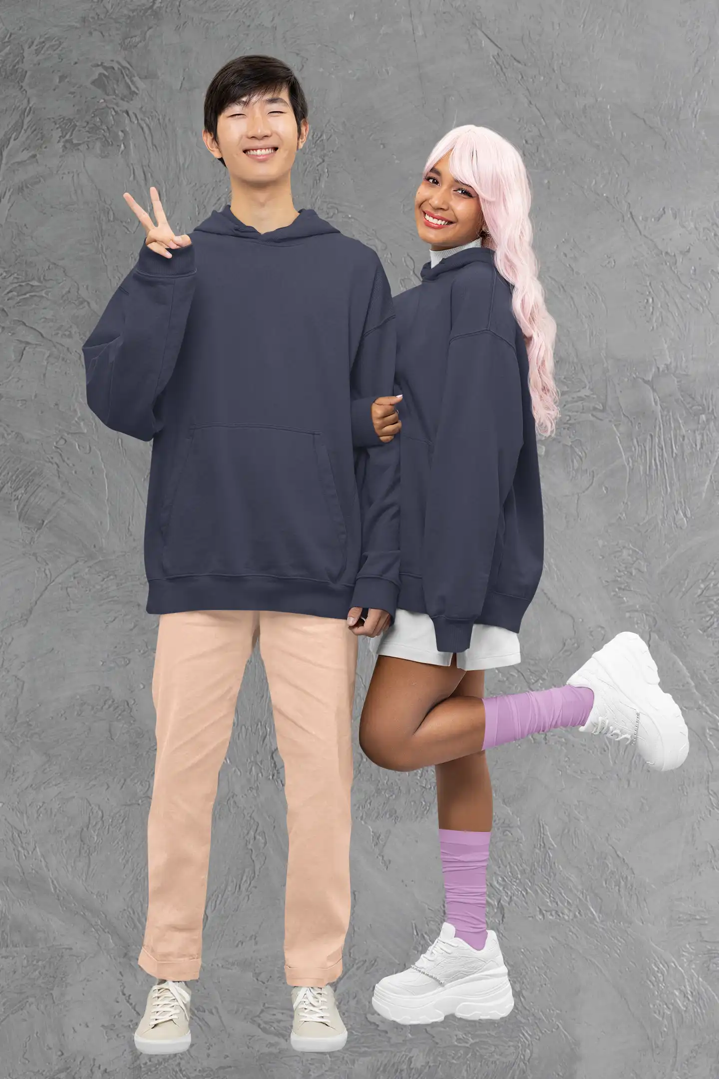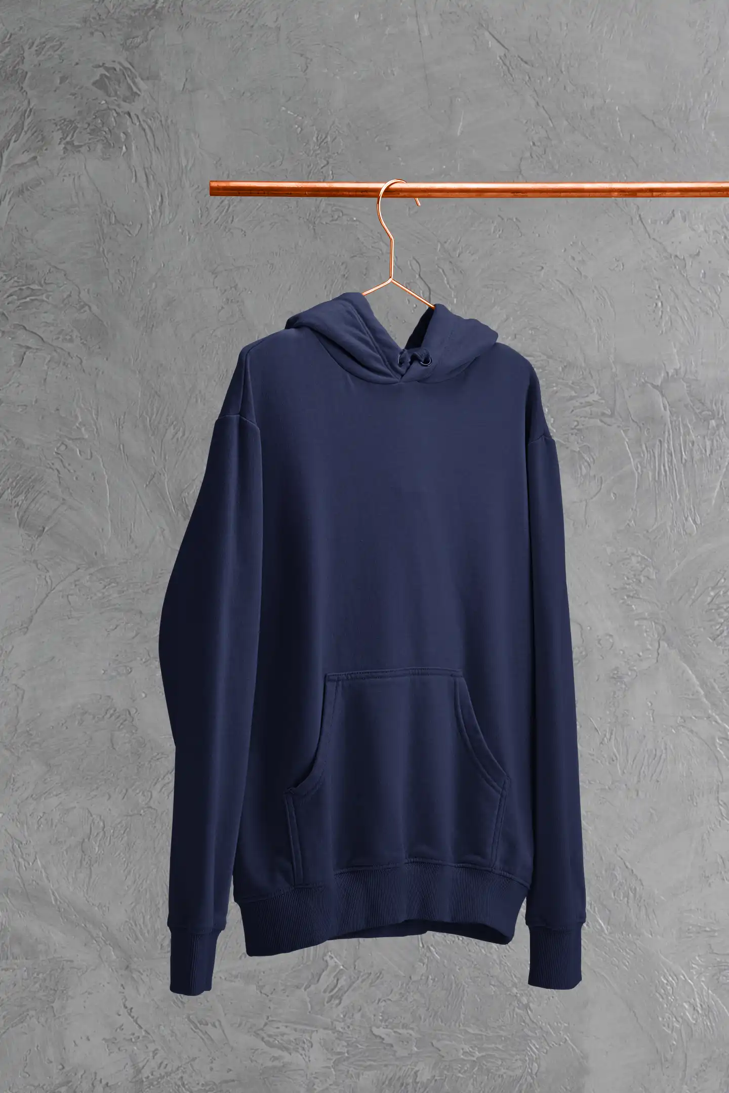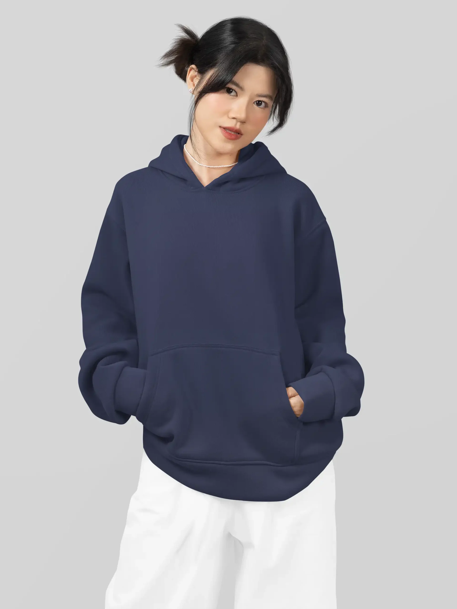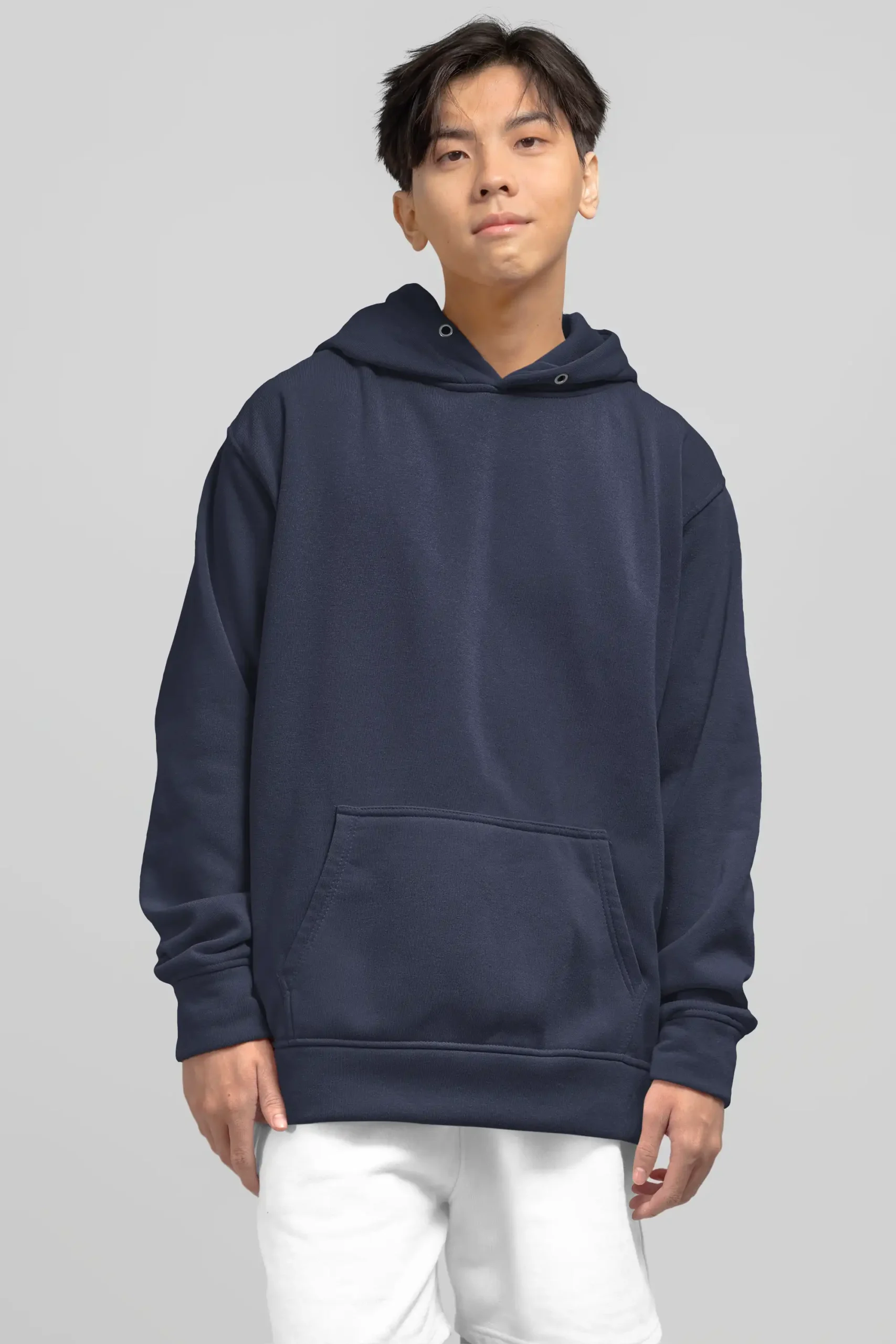 A classic navy blue oversized hoodie made from 400 GSM cotton blend fabric for warmth, comfort, and streetwear styling.