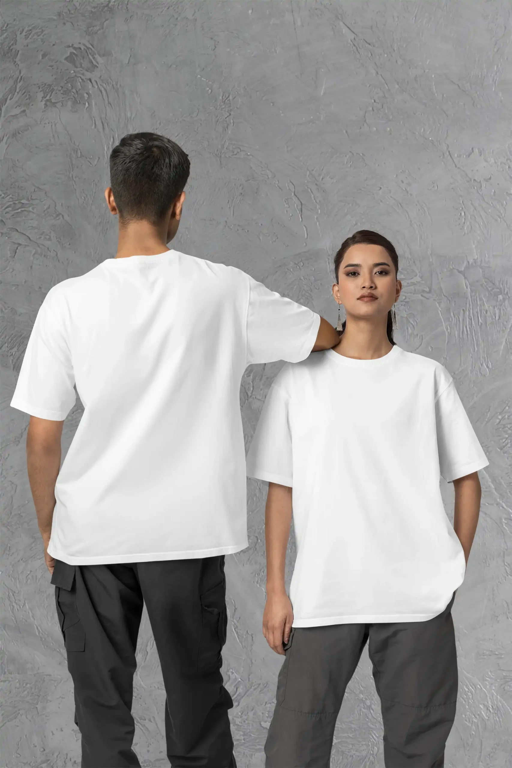 Couple posing in M4S Solids Terry Oversized White Unisex TeeM4S Solids Terry Oversized White Unisex Tee Placed on a hanger