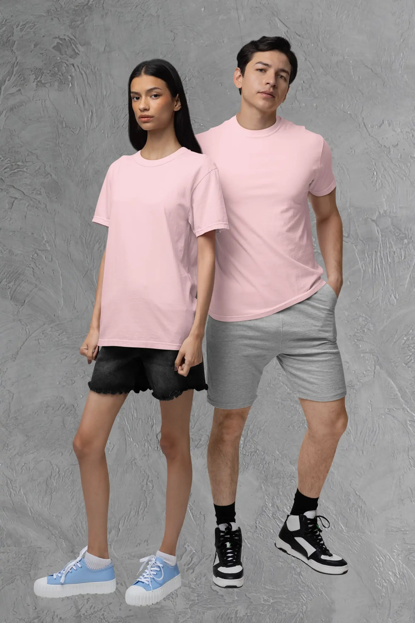 Couple posing in M4S Solids Terry Oversized Flamingo Unisex TeeM4S Solids Terry Oversized Flamingo Unisex Tee Placed on a hanger