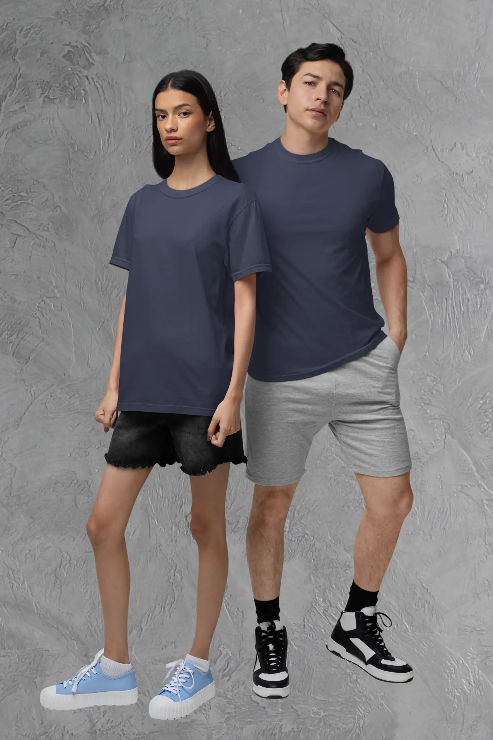 Couple posing in M4S Solids Terry Oversized White Unisex TeeM4S Solids Terry Oversized White Unisex Tee Placed on a hanger