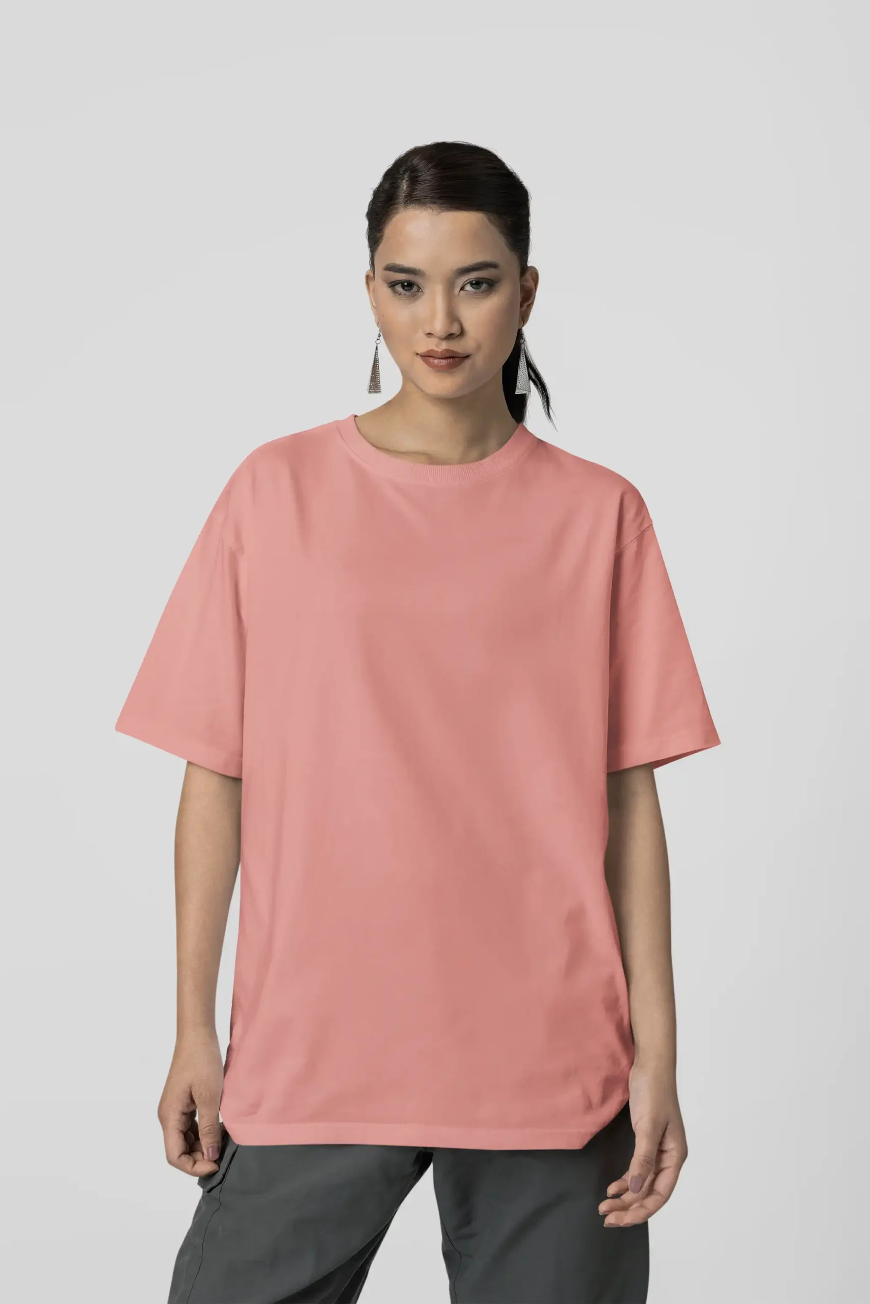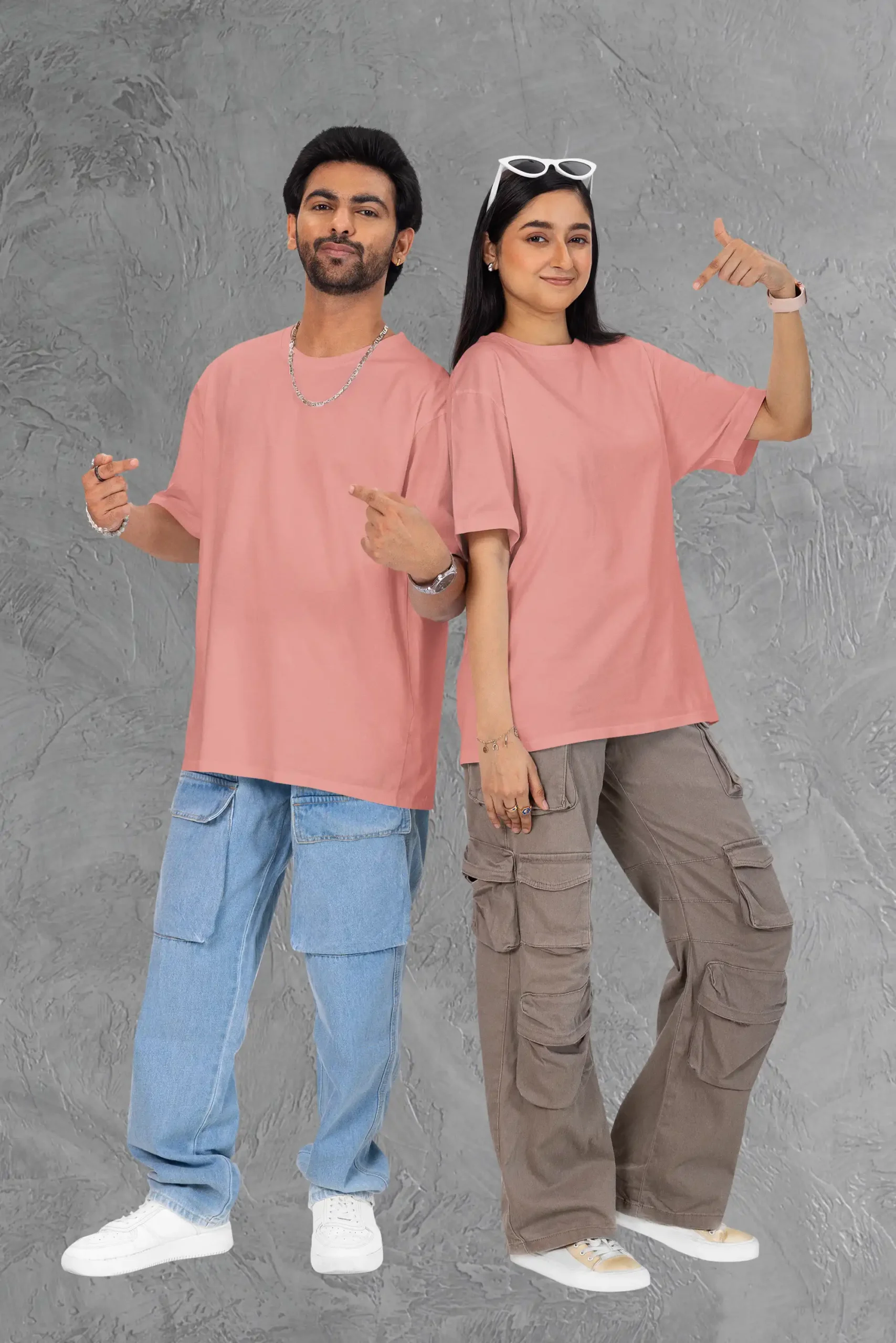 Couple posing in M4S Solids Terry Oversized Flamingo Unisex TeeM4S Solids Terry Oversized Flamingo Unisex Tee Placed on a hanger